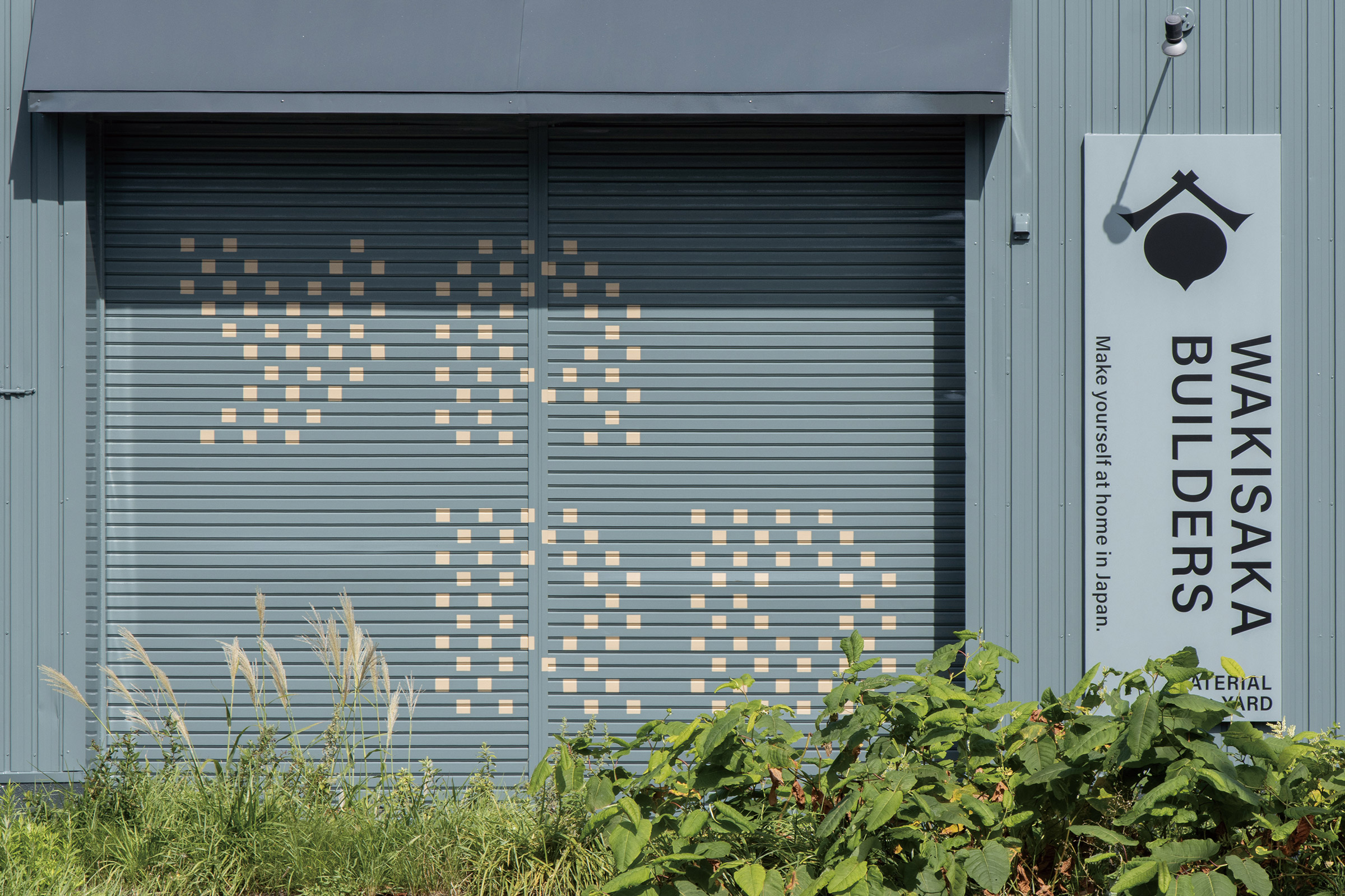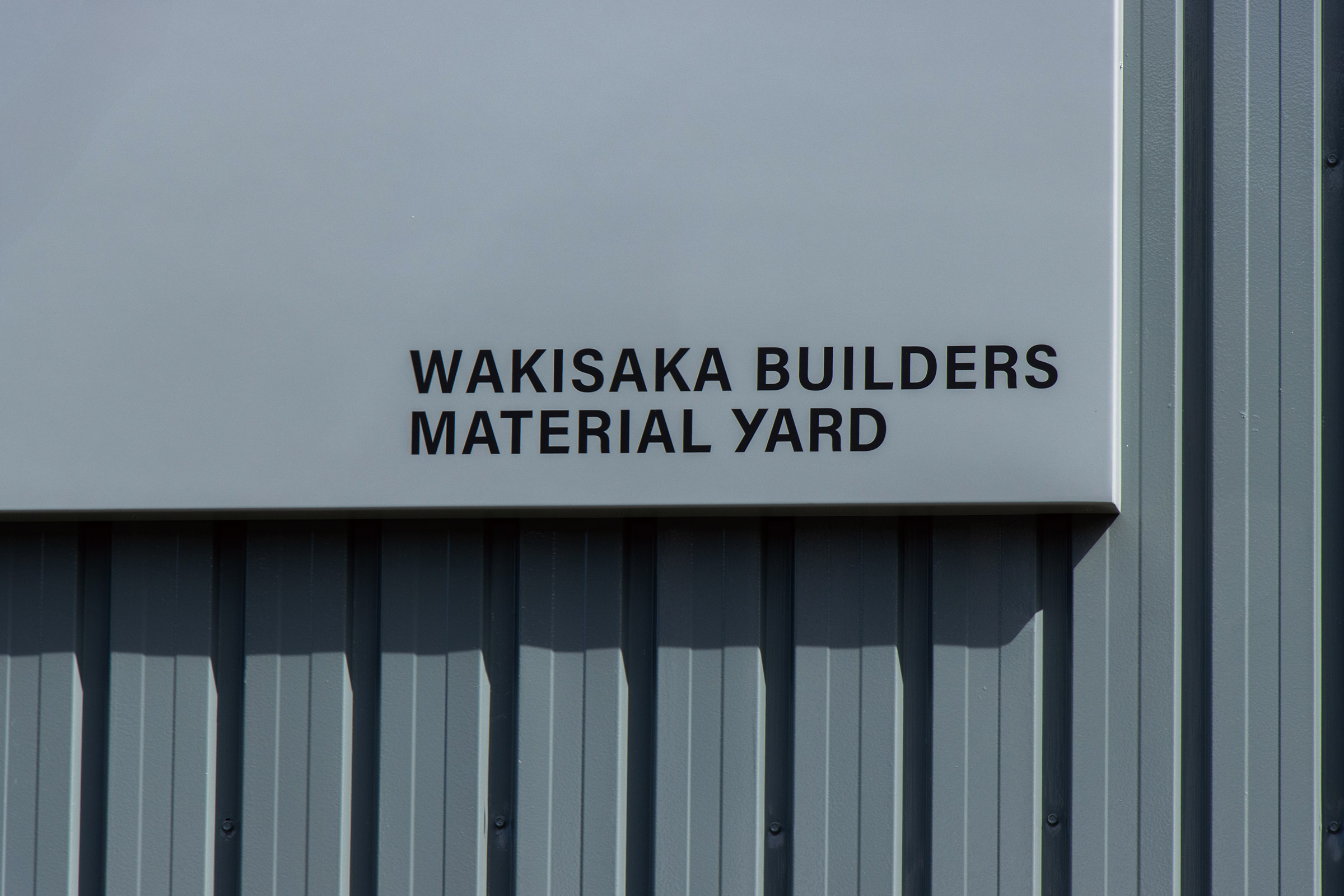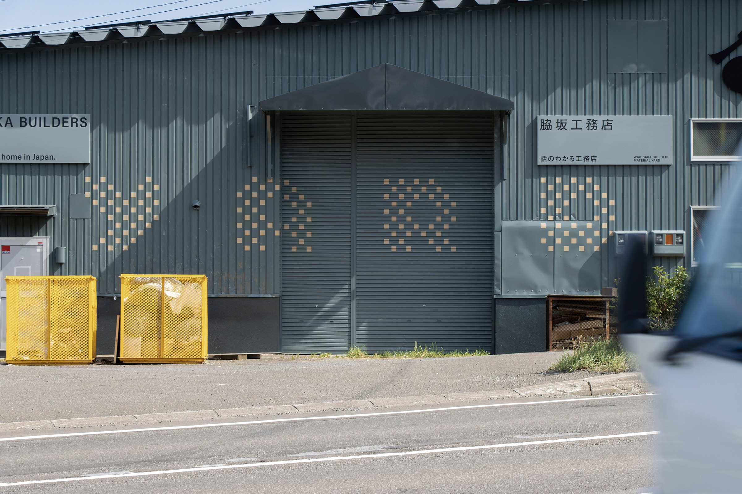 いわゆる「土場」の改装デザインを担当いたしました。資材・木材置き場ということで、角材を積んだイメージから着想を得て、ゴミ入れのなどの形ともリンクする四角いドットの文字を制作。ラフ案では日本語でそのまま「土場」や「DOBA」も検討していましたが、最終的に欧文で「YARD」に決定し、トタンのピッチで塗装をしていただきました。ゴミ入れの黄色や角材の色とのバランスを考慮し全体のカラーリングを決定しています。