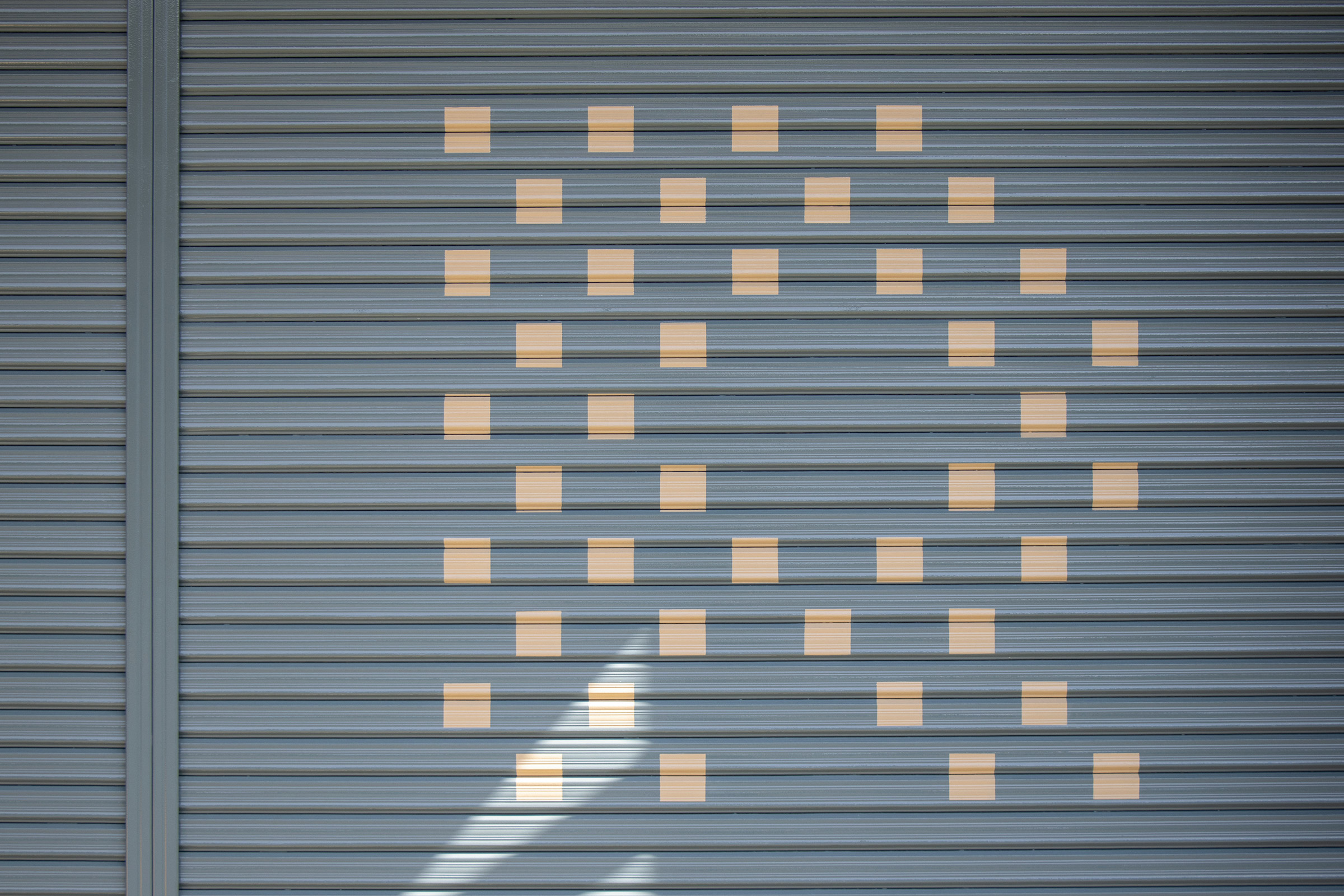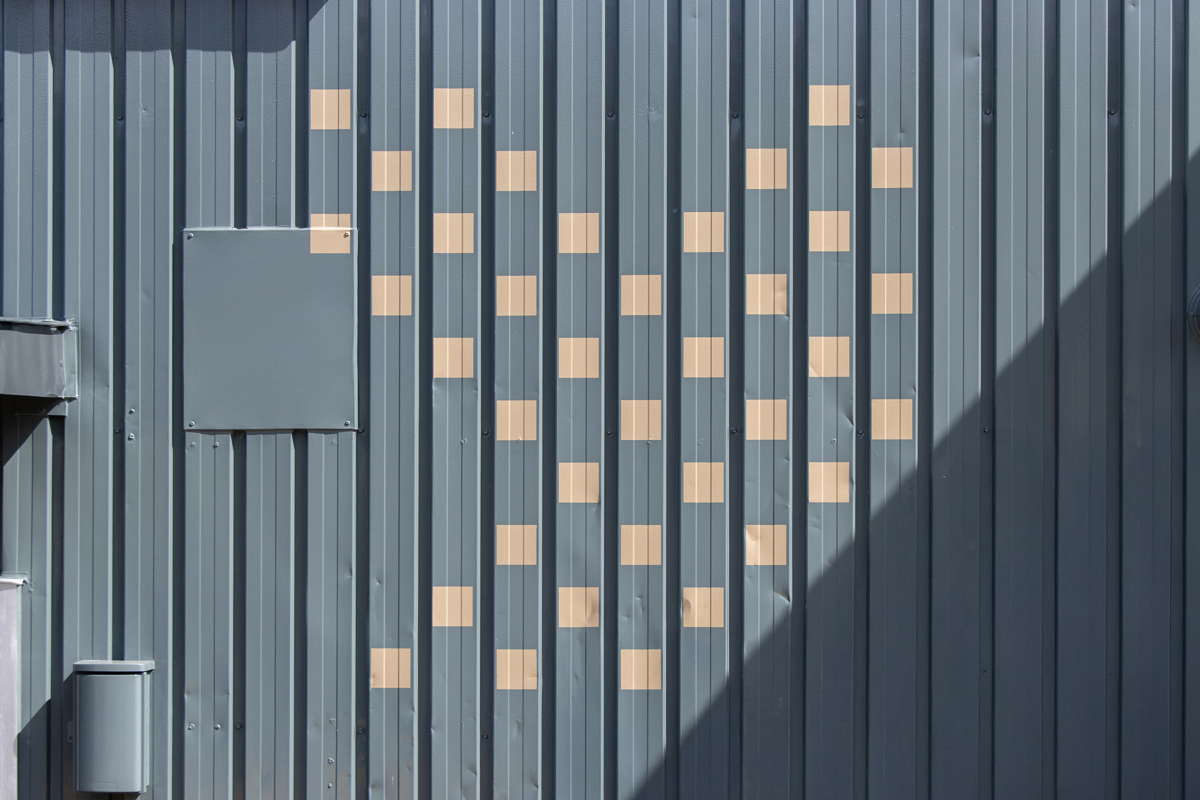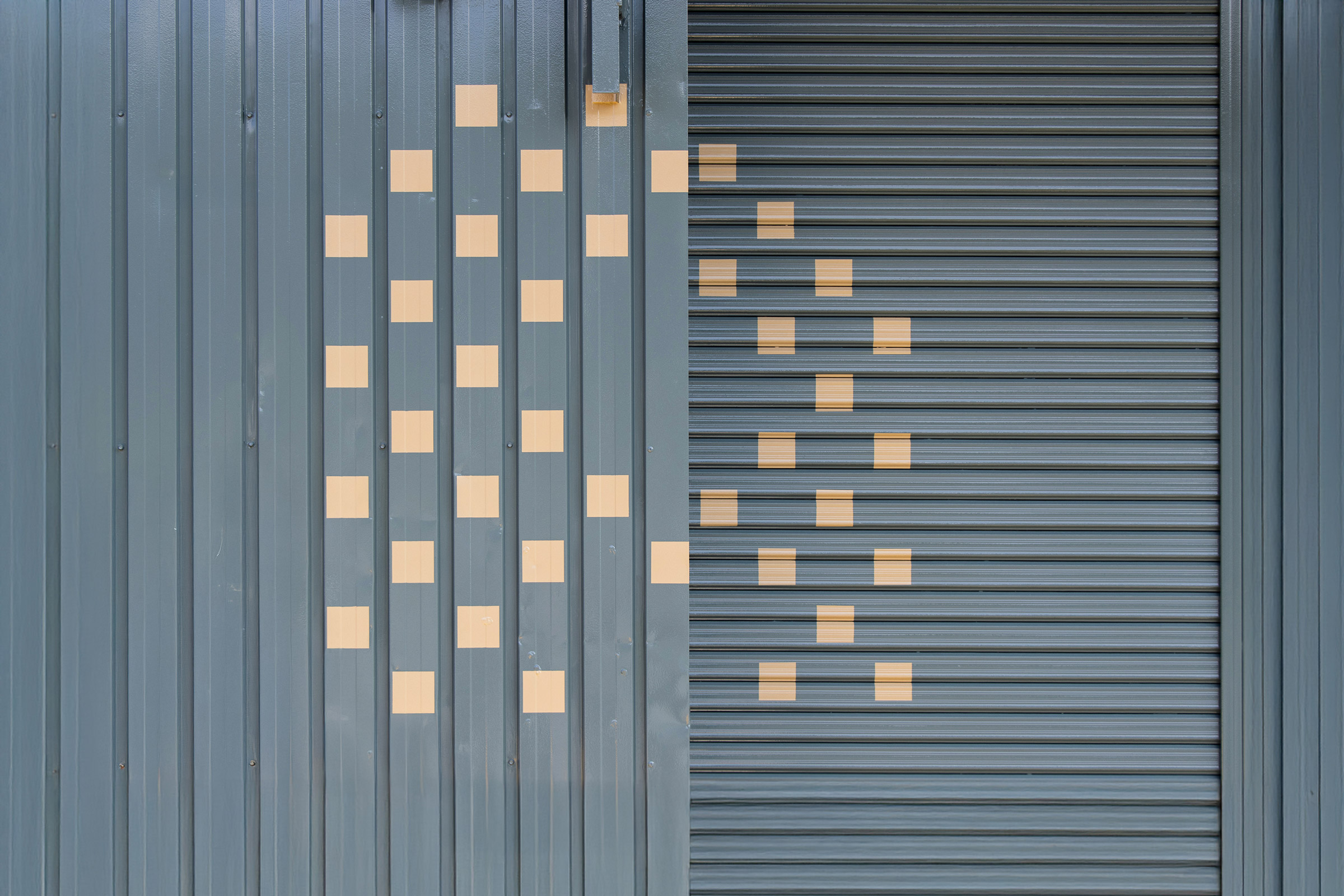 いわゆる「土場」の改装デザインを担当いたしました。資材・木材置き場ということで、角材を積んだイメージから着想を得て、ゴミ入れのなどの形ともリンクする四角いドットの文字を制作。ラフ案では日本語でそのまま「土場」や「DOBA」も検討していましたが、最終的に欧文で「YARD」に決定し、トタンのピッチで塗装をしていただきました。ゴミ入れの黄色や角材の色とのバランスを考慮し全体のカラーリングを決定しています。